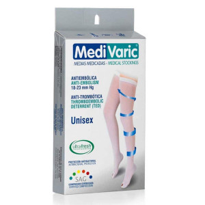 Las medias de compresión antiembólicas, antiembolia, antitrombóticas o antitrombos con compresión de 18-23 mmHg son de venta libre, en presentación al muslo, de apariencia opaca con suave tejido y fibras especiales para un ajuste perfecto.