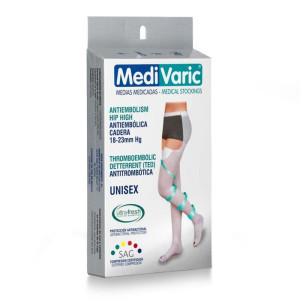 Estás medias de compresión antiembólicas, antitrombóticas, antiembolia o antitrómbos son de venta libre y tienen una compresión de 18 a 23 mmHg en la presentación a la cadera, para uso tanto de hombres como de mujeres, con una apariencia opaca, tejido suave, y fibras especiales para un ajuste.